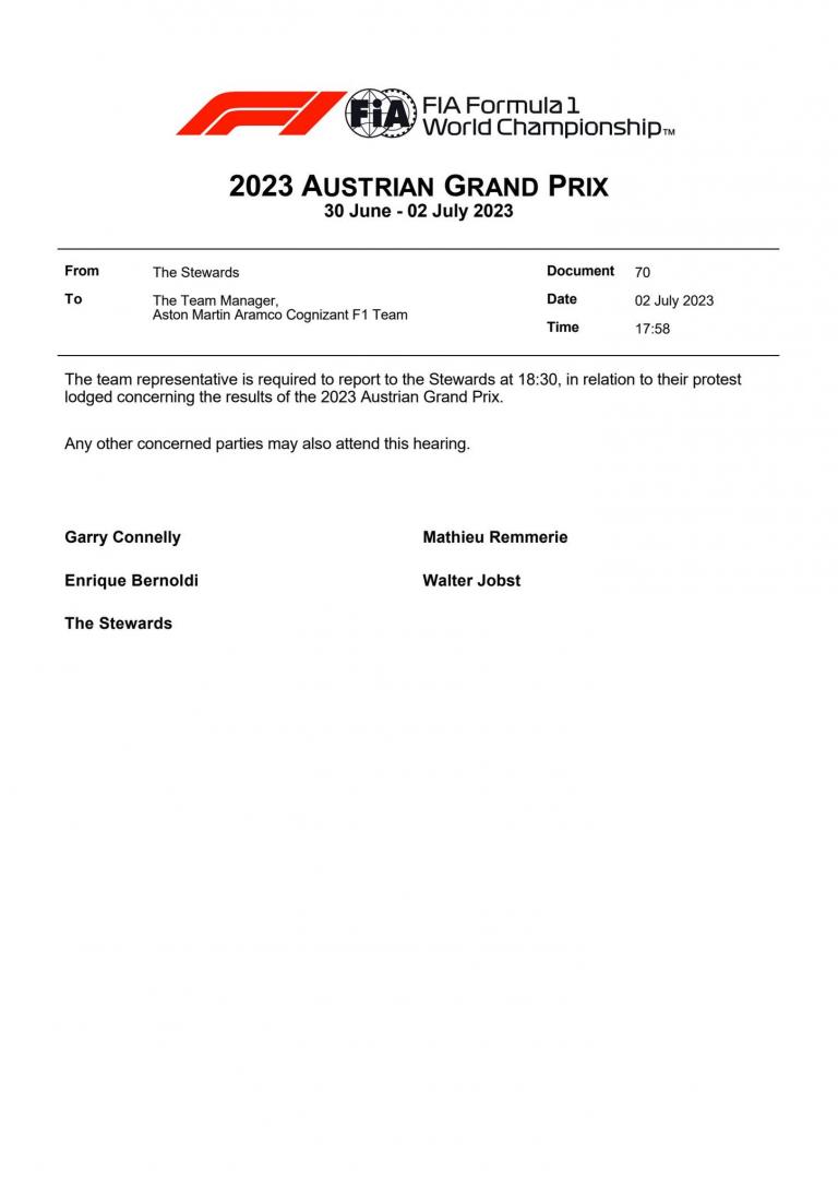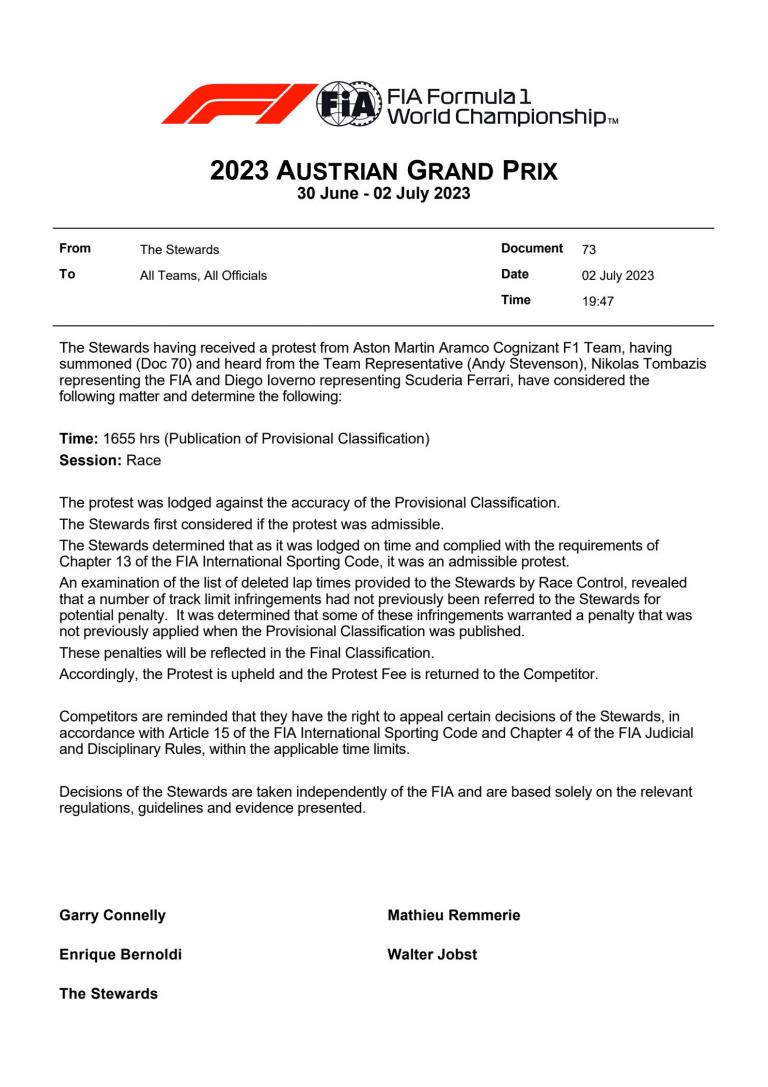 La plainte d’Aston Martin est bien confirmée, la FIA ayant déjà déclaré qu'elle examinait toujours les incidents concernant les limites de piste et qu’elle mettrait ainsi à jour le résultat.
