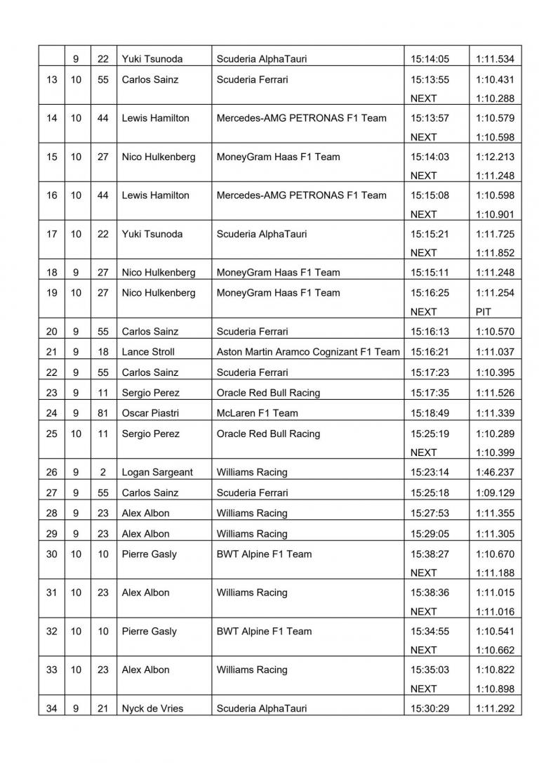 13 L.Logan SARGEANT (Williams) +1 tour (T.70) 18   5 223.309 km/h 1:09.611 (T.45)