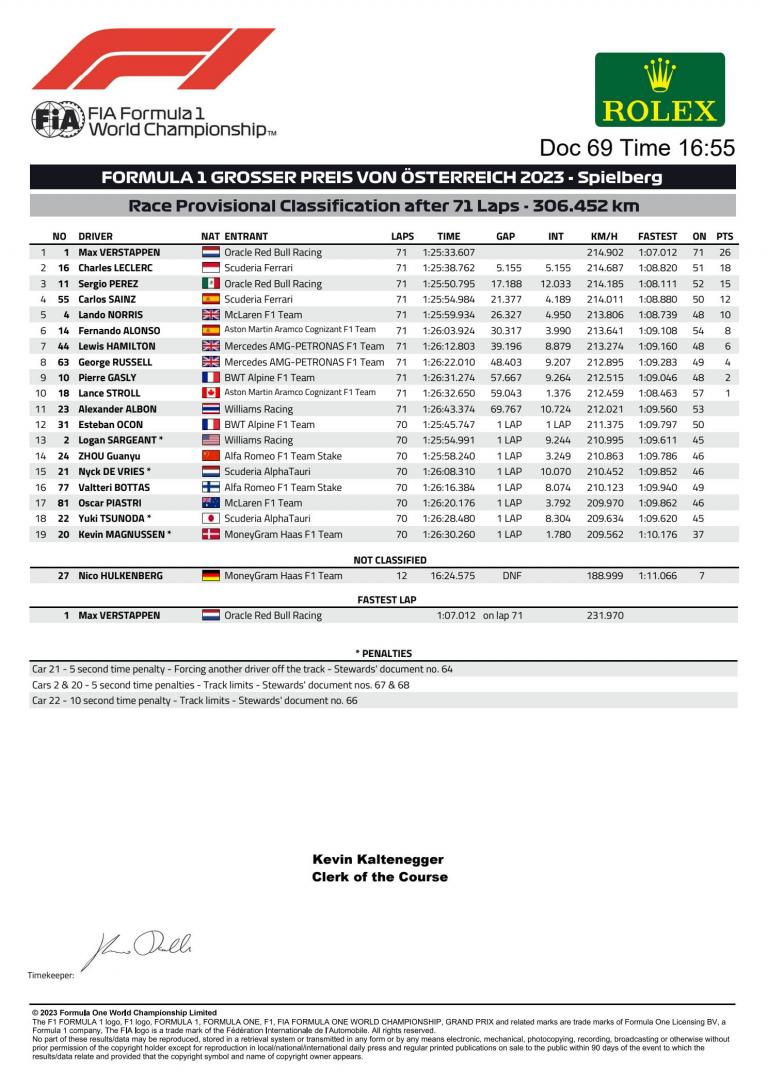 Résultats du Grand Prix de F1 d'Autriche 2023