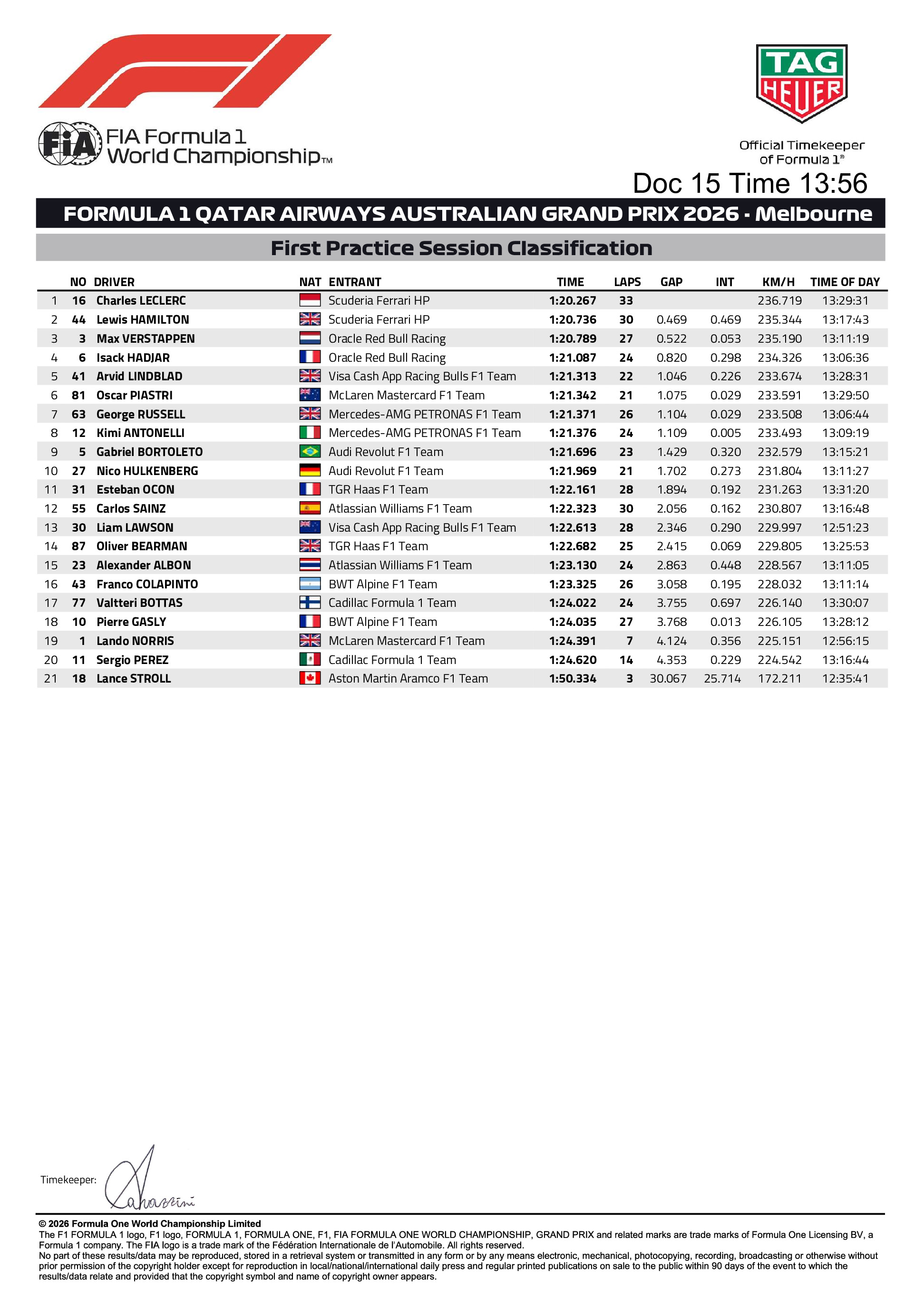 Les Cadillac de Valtteri Bottas et Sergio Perez prennent les dix-neuvième et vingtième positions. Carlos Sainz termine vingt-et-unième après n'avoir couvert qu'un seul tour avant son immobilisation, tandis que Lance Stroll n'a finalement pas participé à la séance en raison d'un problème suspecté sur le moteur thermique de son Aston Martin.