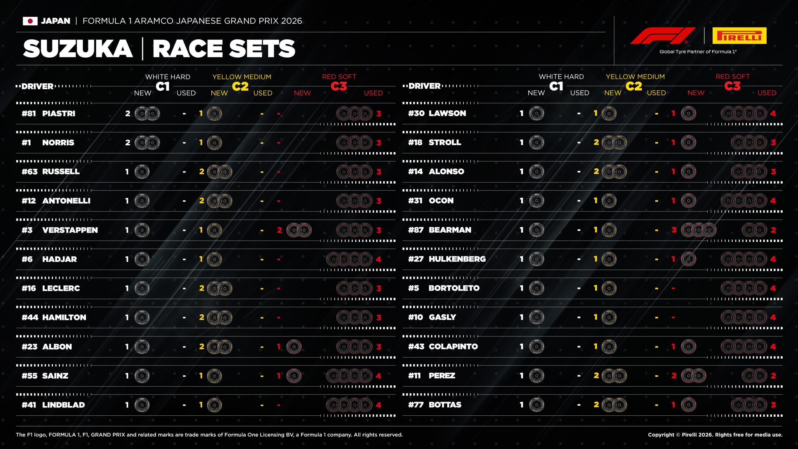 À Suzuka, la configuration du tracé (étroit, rapide, à fort appui et très exigeant dans les enchaînements de type "Esses") continue de placer la position en piste au centre de l'équation. Dans ce contexte, la stratégie reste un levier déterminant, d'autant que le dépassement demeure structurellement difficile malgré les outils aérodynamiques et énergétiques introduits en 2026. La dégradation reste présente mais maîtrisable, et l'exploitation des pneus dépendra fortement de la capacité des équipes à gérer le glissement et les phases de recharge.