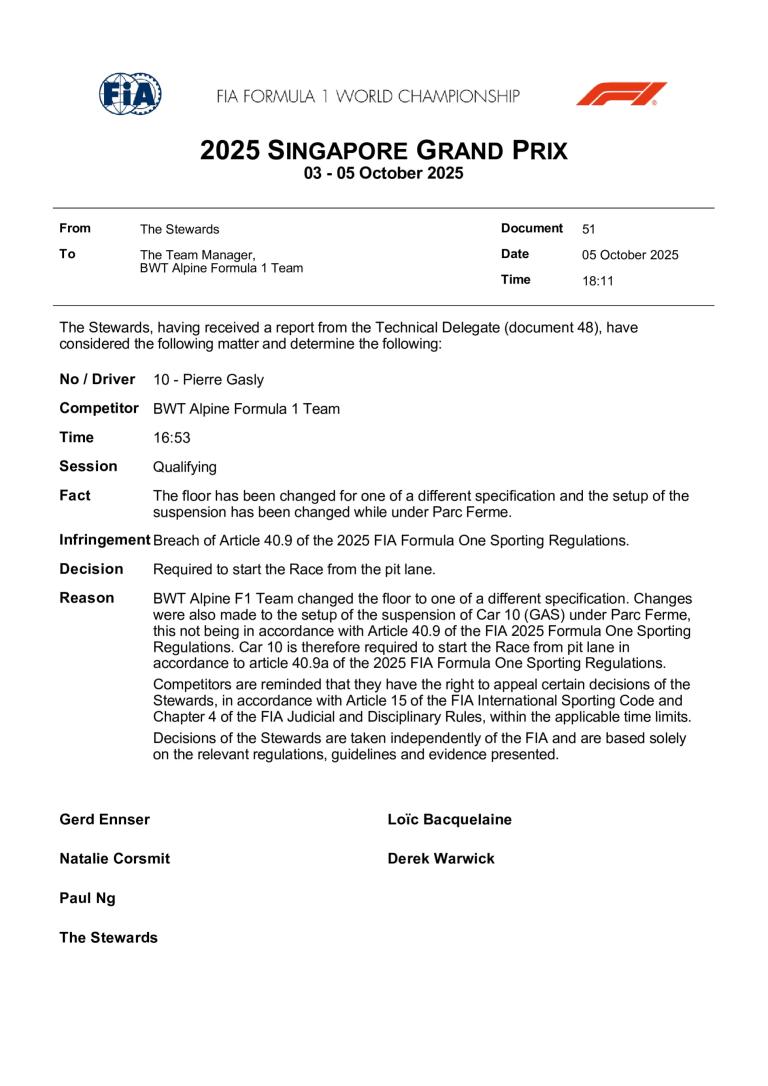 Les pilotes pour cette saison sont Pierre Gasly et Franco Colapinto, portant respectivement les numéros 10 et 43.