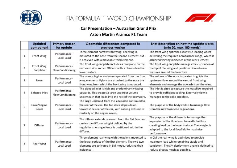 Aston Martin introduit plusieurs évolutions sur l'AMR26 pour la manche d'ouverture de la saison 2026 à Melbourne. Les modifications portent sur l'aileron avant, les plaques d'extrémité de cet aileron, le nez, les entrées des pontons, la carrosserie arrière, le diffuseur et l'aileron arrière. L'ensemble s'inscrit dans l'architecture imposée par le règlement 2026 tout en cherchant à optimiser l'équilibre aérodynamique et la gestion des flux vers l'...