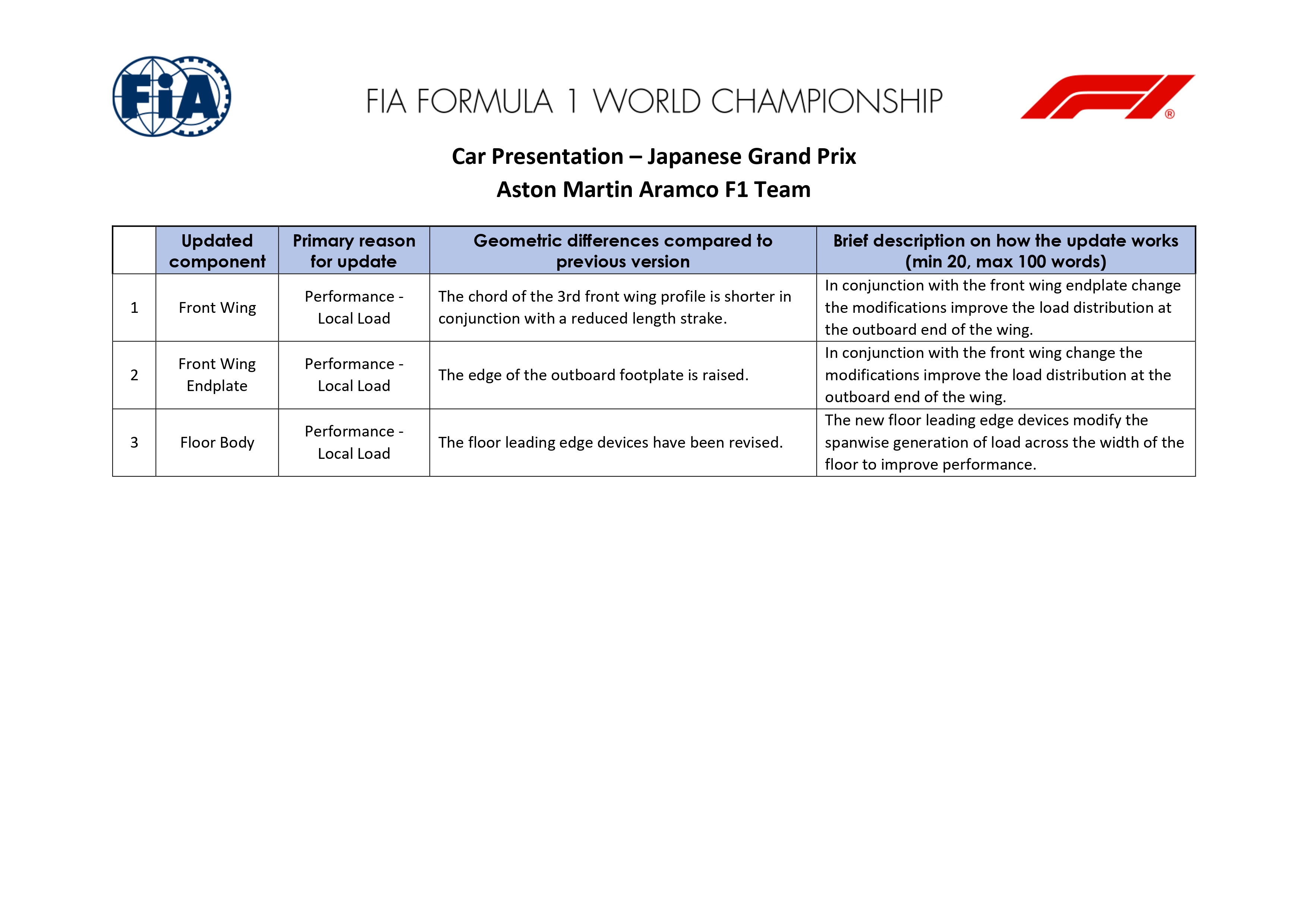 Aston Martin introduit à Suzuka un ensemble d'évolutions portant sur l'aileron avant et le plancher, avec un travail concentré sur la répartition de la charge à l'avant de l'AMR26 et sur la génération d'appui au niveau du plancher.