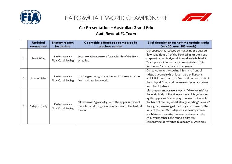 Audi introduit plusieurs évolutions notables sur la R26 pour sa première apparition en championnat du monde de Formule 1 à Melbourne. Les modifications concernent principalement l'aileron avant ainsi que l'architecture des pontons, en particulier leurs entrées d'air et la forme générale de leur carrosserie.