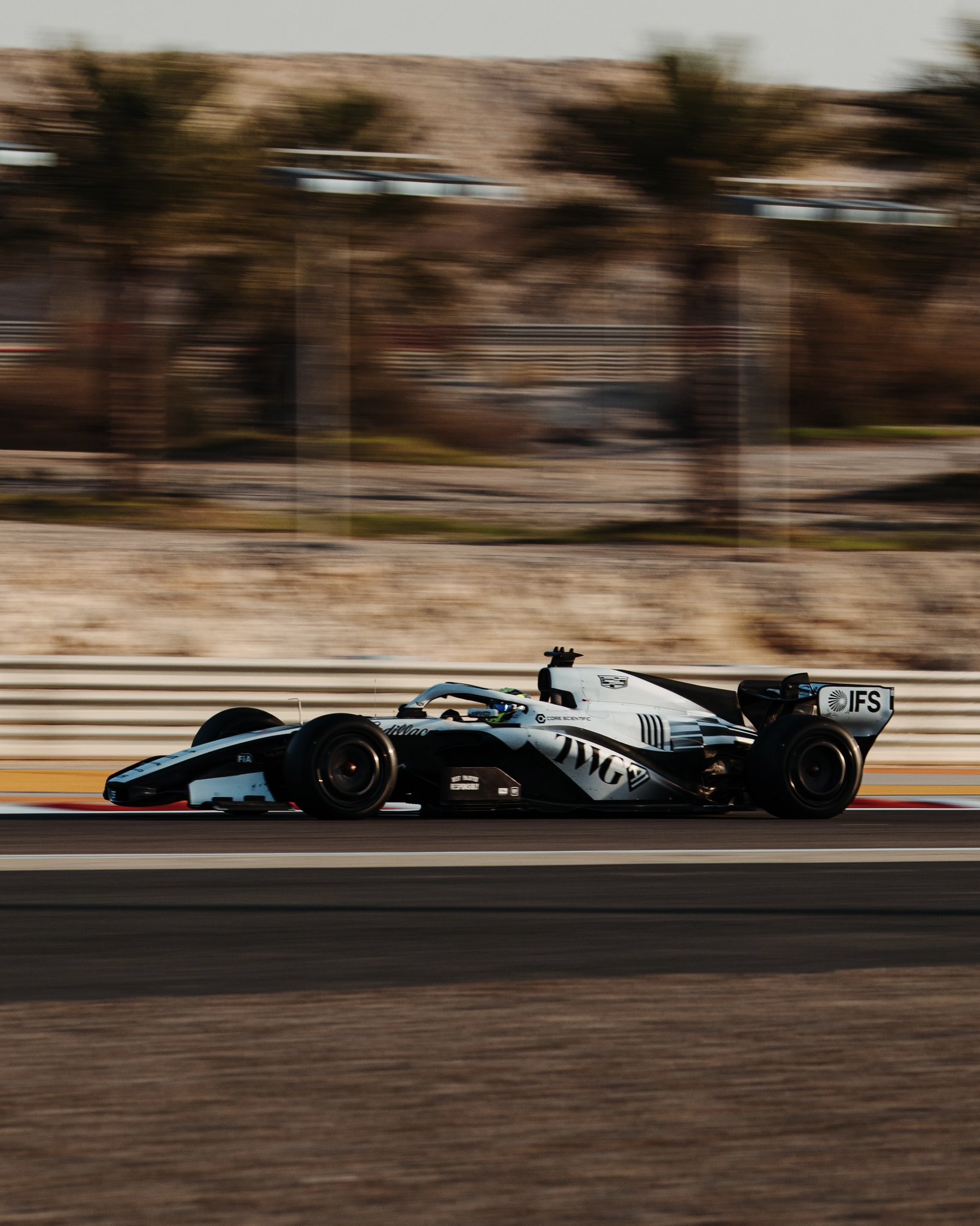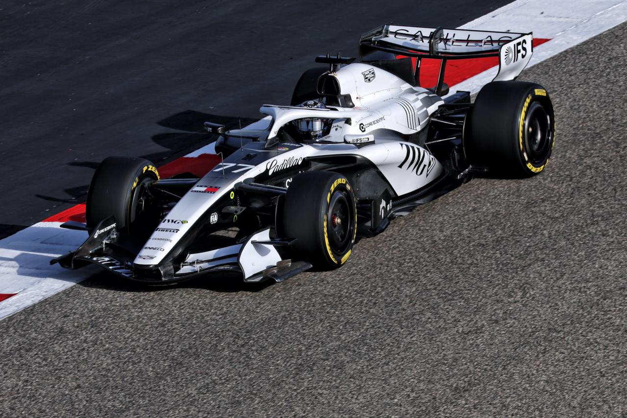 La Cadillac 2026, première Formule 1 de la marque américaine, a désormais pris la piste avec sa livrée définitive. Les éléments à l'aspect chromé aperçus lors des présentations ont laissé place à un covering blanc, confirmant le parti pris annoncé d'un schéma noir et blanc.