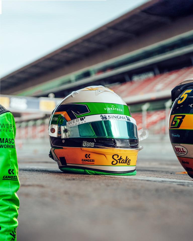 Son casque, aux tons or, vert et bleu, rend hommage à son Brésil natal avec des détails évoquant la famille, la foi et la nature.