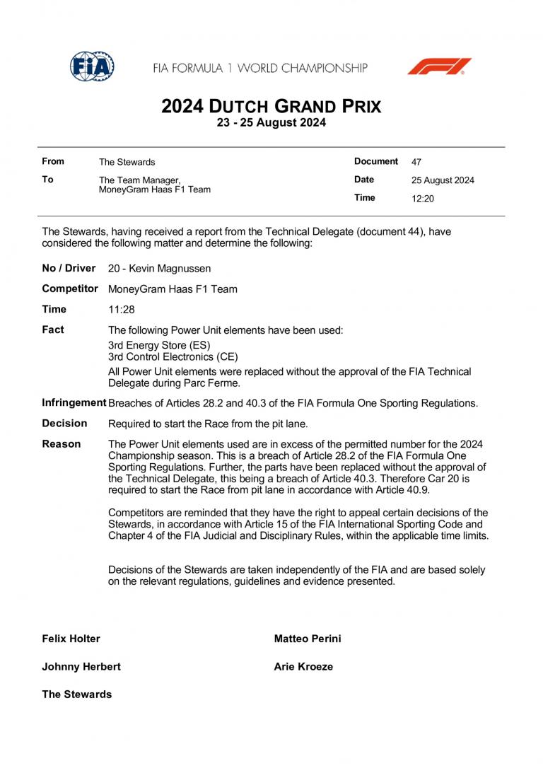 Kevin Magnussen, pilote de l'écurie Haas, a été sanctionné pour avoir effectué des changements non autorisés sur son unité de puissance alors que sa voiture était en conditions de Parc Fermé. Plus précisément, la troisième batterie (Energy Store - ES) et la troisième unité de contrôle électronique (Control Electronics - CE) ont été utilisées, dépassant le nombre de composants autorisés pour la saison 2024. De plus, ces éléments ont été remplacés ...