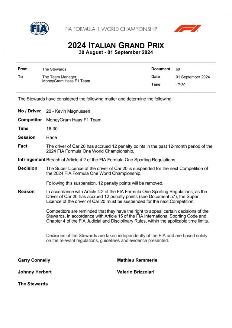 Remplacé par Ollie Bearman en Azerbaïdjan suite à une suspension d'un Grand Prix pour avoir liquidé la totalité des points sur son permis, Kevin Magnussen revient avec un compteur réinitialisé.