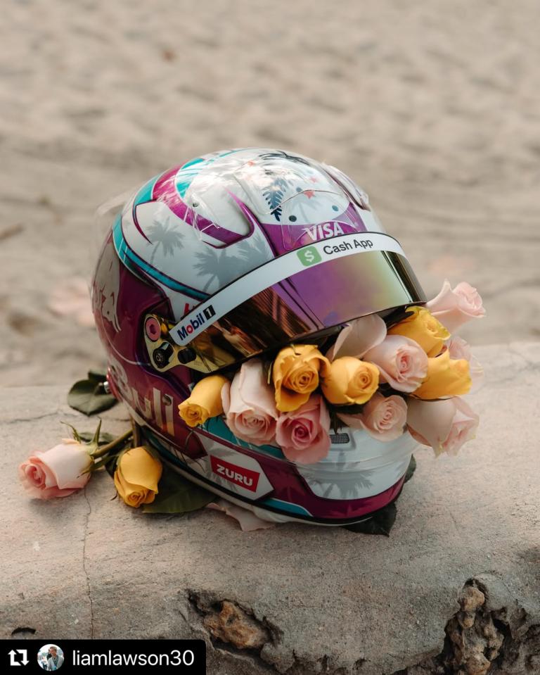 Casque spécial #MiamiGP pour Liam Lawson qui pilotera une Racing Bulls avec livrée rose fluo.