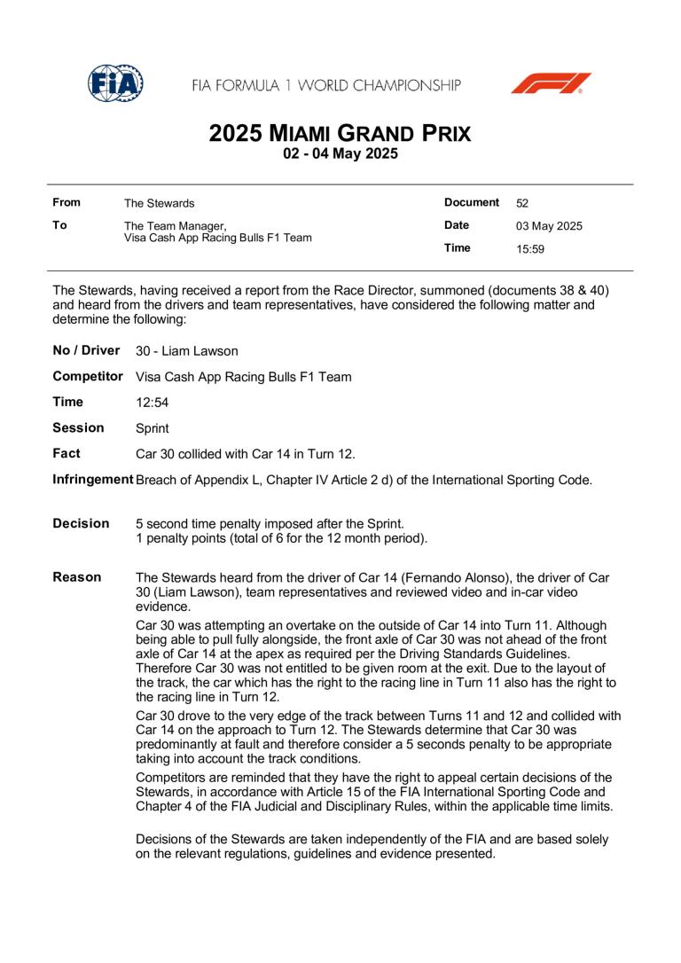 Au terme de l'examen du contact survenu dans le virage 12 entre Liam Lawson et Fernando Alonso pendant le Sprint à Miami, les commissaires ont jugé le pilote Racing Bulls "principalement responsable" de l'incident. Pourtant, à la lecture des faits, la manœuvre ne relève pas d'un excès manifeste ou dangereux : Lawson avait réussi à se porter entièrement à hauteur d'Alonso à l'extérieur dans le virage 11, mais son essieu avant n'était pas devant ce...