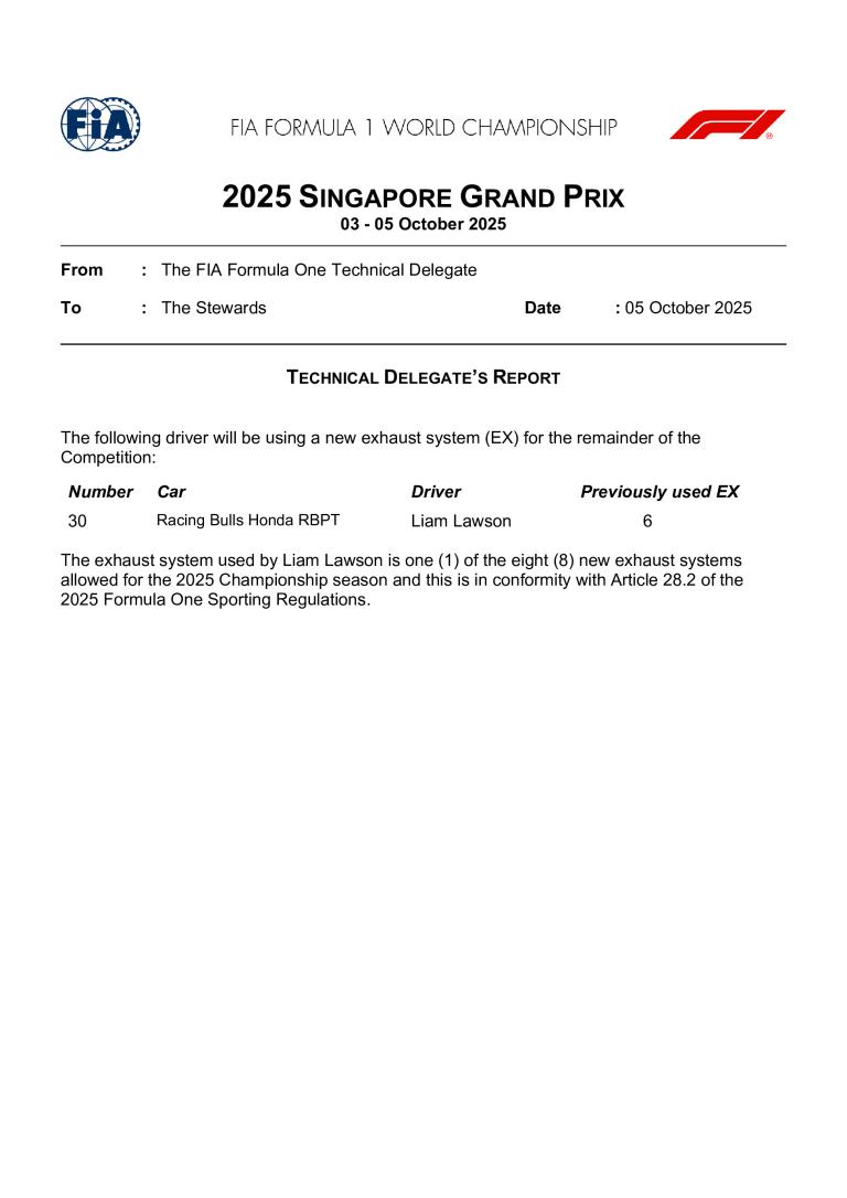 Liam Lawson utilisera un nouvel échappement sur sa VCARB pour le reste du Grand Prix de Singapour. Le pilote néo-zélandais en est à son septième élément de la saison, sur les huit autorisés par le règlement sportif 2025 (article 28.2). Rien d'irrégulier donc dans cette opération validée par la FIA.