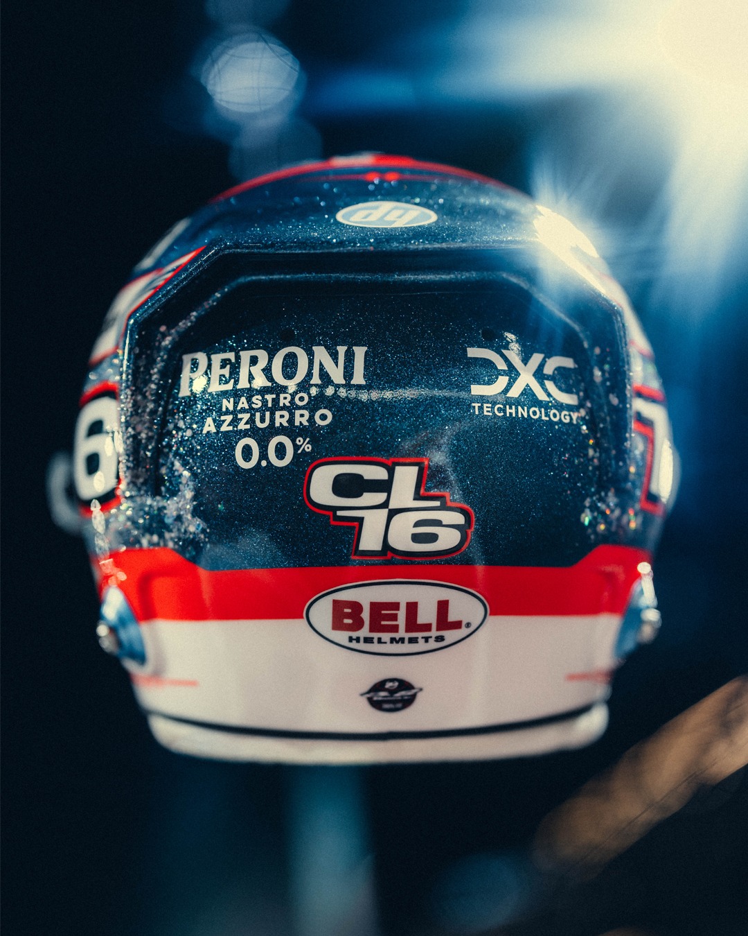 Charles Leclerc a un casque particulier pour le Grand Prix de Singapour 2025. Le Monégasque a choisi une variation pailletée de son design habituel, où dominent le bleu profond et le rouge, complétés par une finition pailletée qui capte les lumières de Marina Bay.