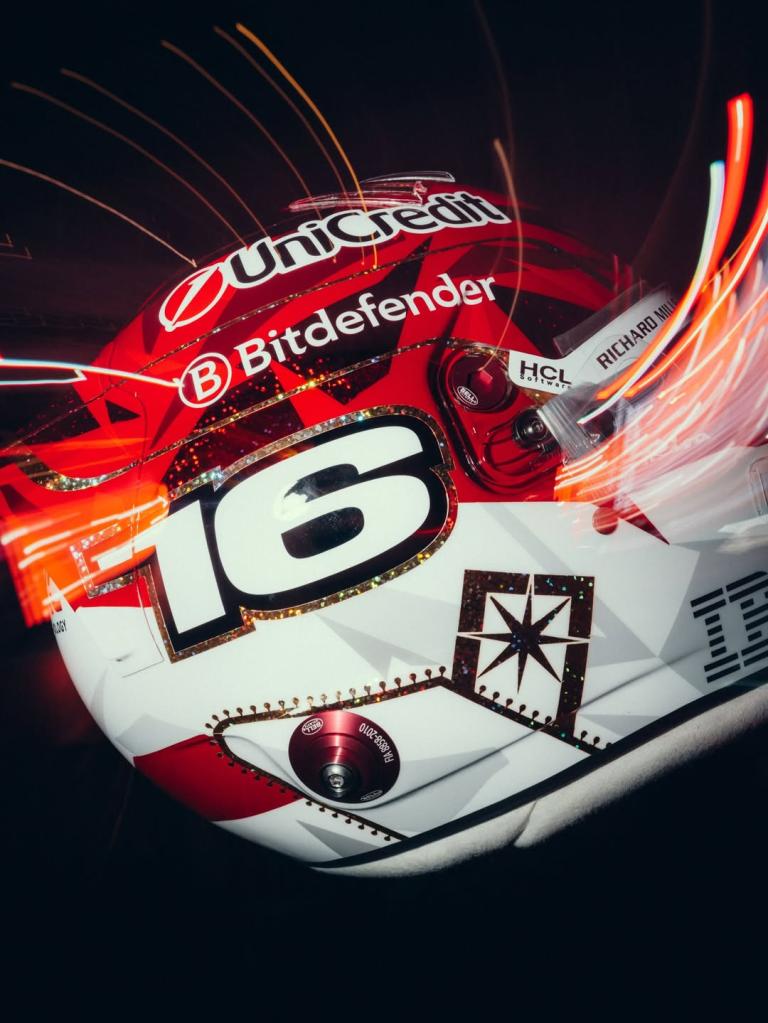 Pour fêter ses 150 Grands Prix de F1 avec la Scuderia Ferrari, Charles Leclerc a un casque spécial pendant le week-end à Abou Dabi, dernier de la saison 2025.