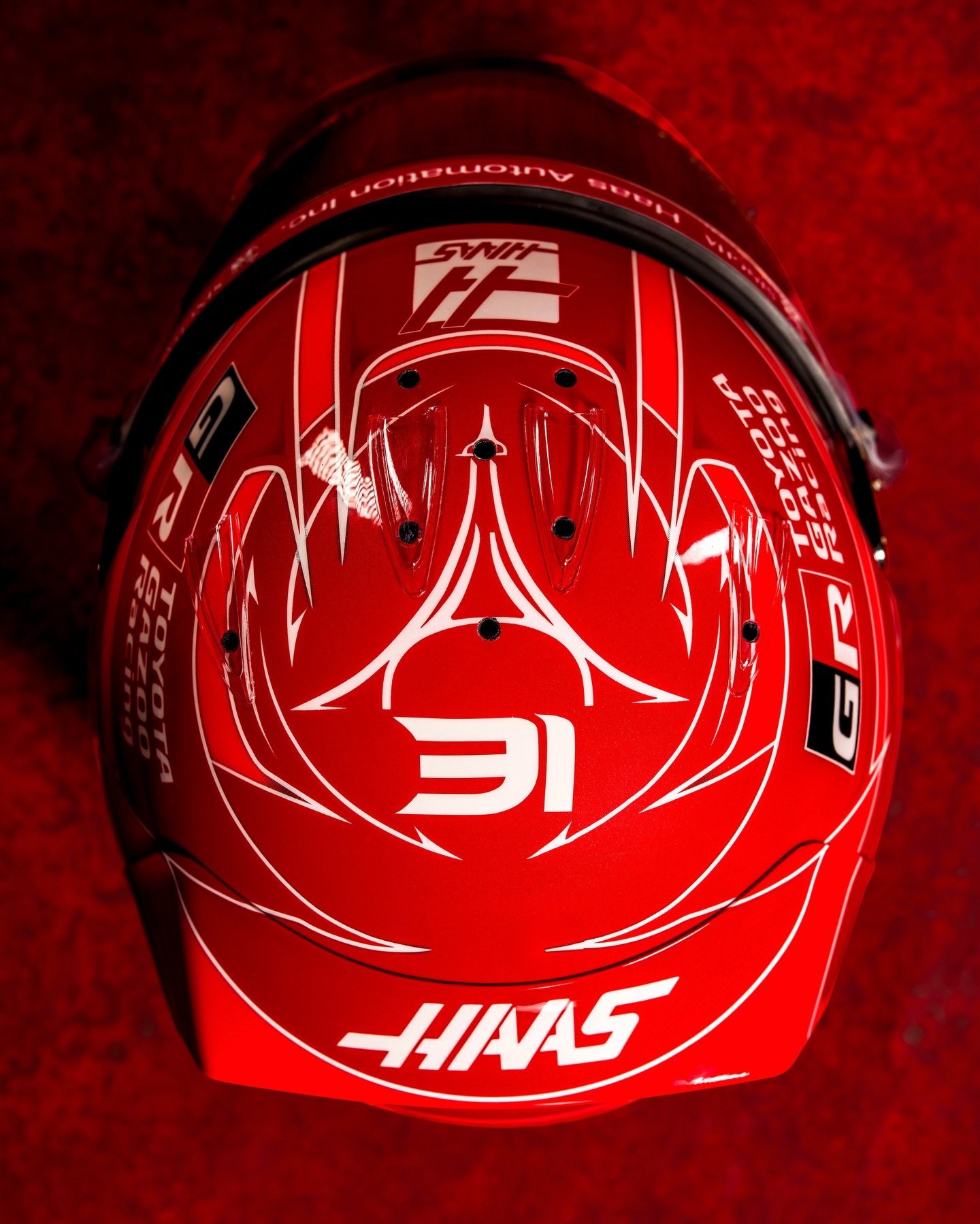 Esteban Ocon a présenté un casque majoritairement rouge pour 2026. Les éléments en noir ont laissé place à un rouge foncé, tout en gardant les détails habituels de son design, notamment la Tour Eiffel sur le dessus, en blanc.