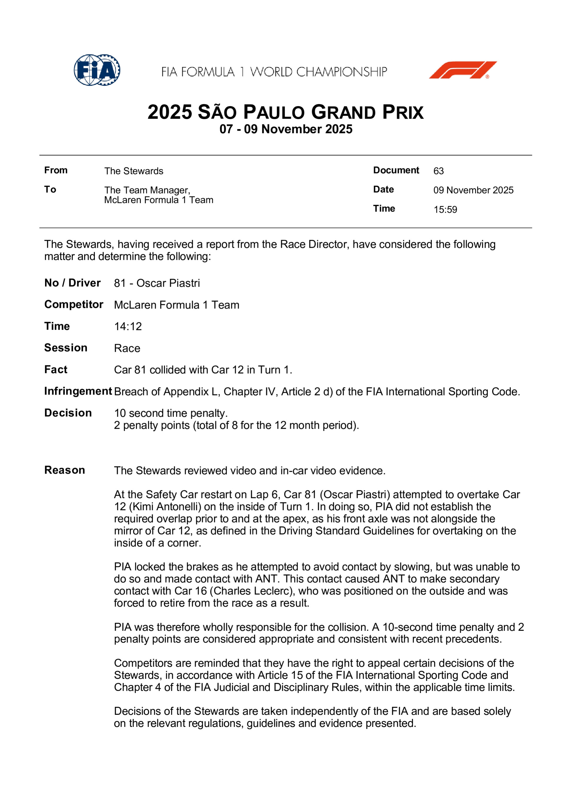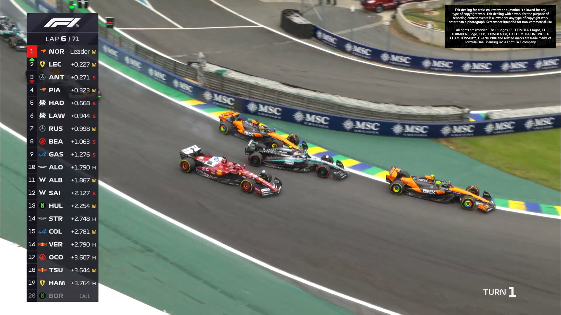 Cinquième à l'arrivée du Grand Prix du Brésil, Oscar Piastri a dû composer avec une pénalité de dix secondes pour son accrochage avec Kimi Antonelli, incident qui a également provoqué l'abandon de Charles Leclerc (qui n'accuse pas Piastri comme responsable principal). Le pilote McLaren, interrogé après la course, a défendu son choix d'attaque : "Non, je ne pense pas avoir de regrets. J'avais une opportunité très claire, je l'ai saisie. Les deux v...