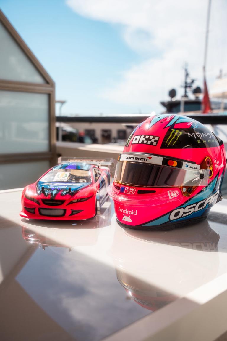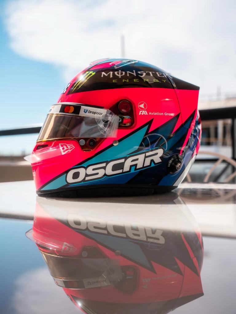 Pour Las Vegas, Oscar Piastri a dévoilé un casque entièrement nouveau, directement inspiré de ses premières années en compétitions de voitures radiocommandées. Le pilote australien fait le lien avec une époque où il enchaînait les victoires en modélisme, arborant déjà cette combinaison de rose vif, de bleu et de noir qu'il reprend aujourd'hui presque à l'identique.