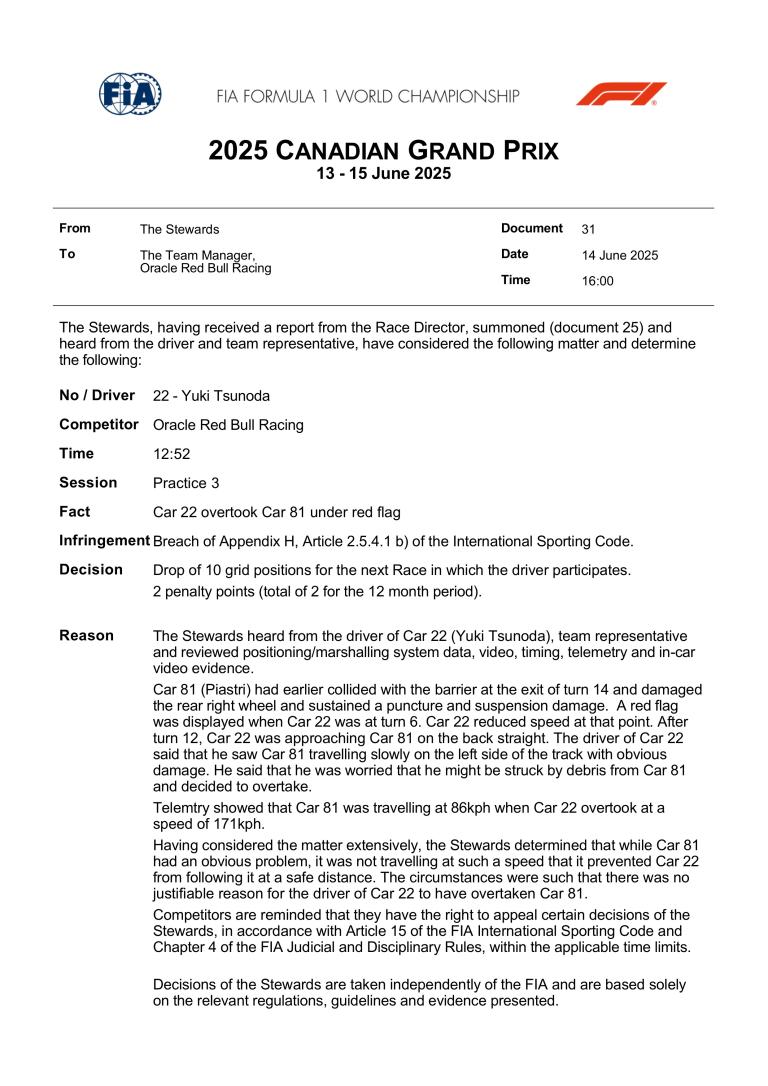 Yuki Tsunoda a écopé d'une pénalité de 10 places sur la grille pour le Grand Prix du Canada et de 2 points de pénalité sur sa super licence, pour avoir dépassé Oscar Piastri (car 81) sous drapeau rouge lors des EL3 à Montréal. Bien qu'il ait ralenti initialement, Tsunoda a dépassé Piastri endommagé à 171 km/h alors que ce dernier roulait à 86 km/h. Les commissaires ont jugé qu'il n'y avait pas de circonstances justifiant ce dépassement sous régim...