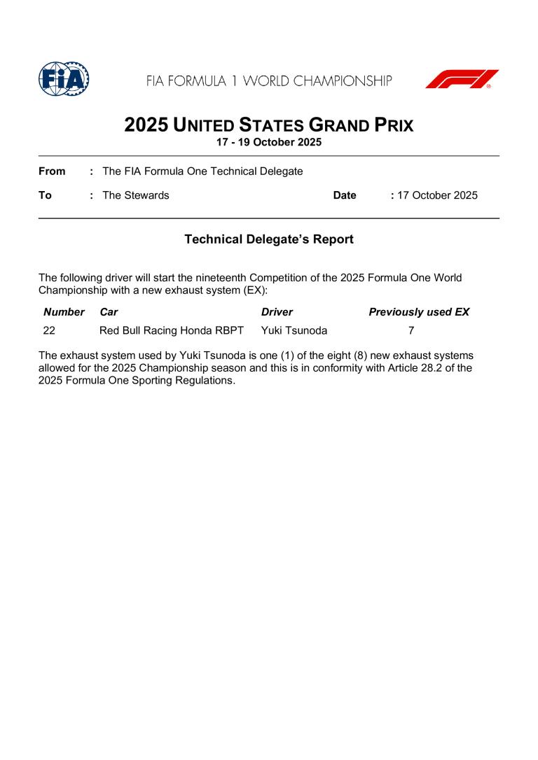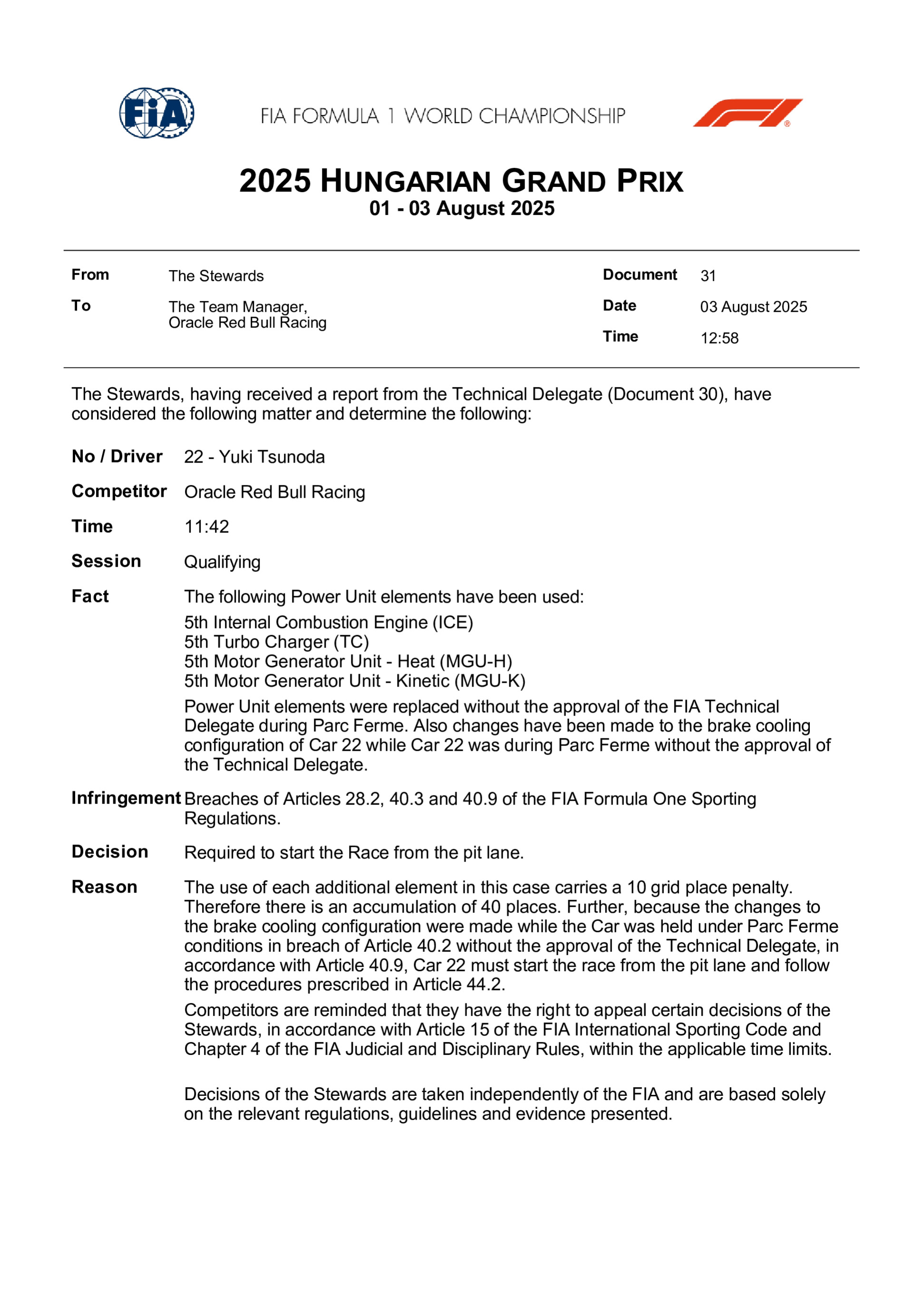 Yuki Tsunoda s'élancera depuis la voie des stands pour le Grand Prix de Hongrie 2025. Les commissaires ont confirmé que la Red Bull n°22 a utilisé un cinquième moteur à combustion interne, un cinquième turbocompresseur, un cinquième MGU-H et un cinquième MGU-K, en plus d'une modification de la configuration de refroidissement des freins, le tout effectué sous régime de parc fermé sans l'accord du délégué technique de la FIA.