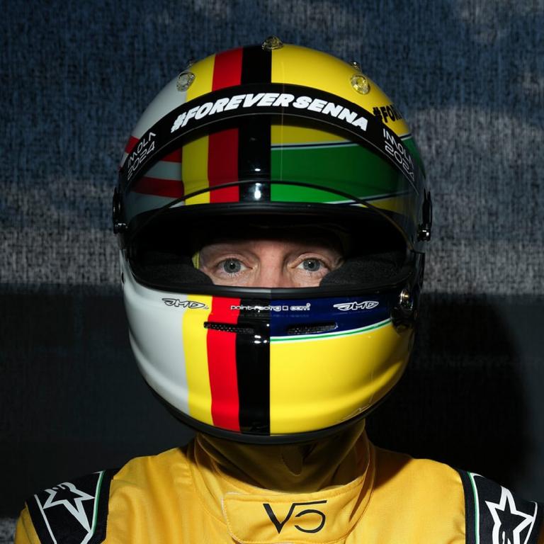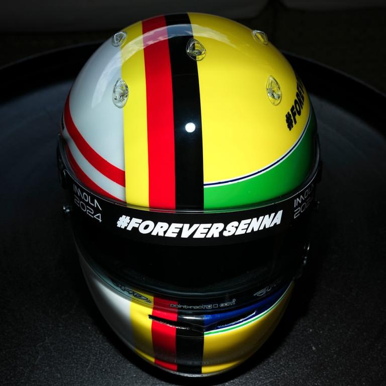 Le casque de Sebastian Vettel, en hommage a Ayrton Senna et Roland Ratzenberger. Il l´a porté en conduisant la dernière McLaren du Brésilien sur le circuit d’Imola.