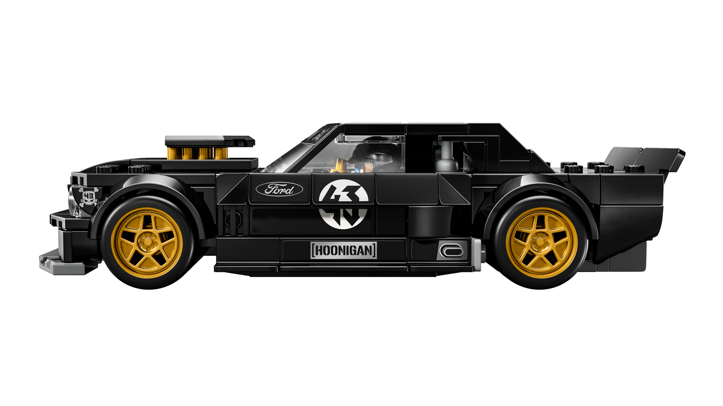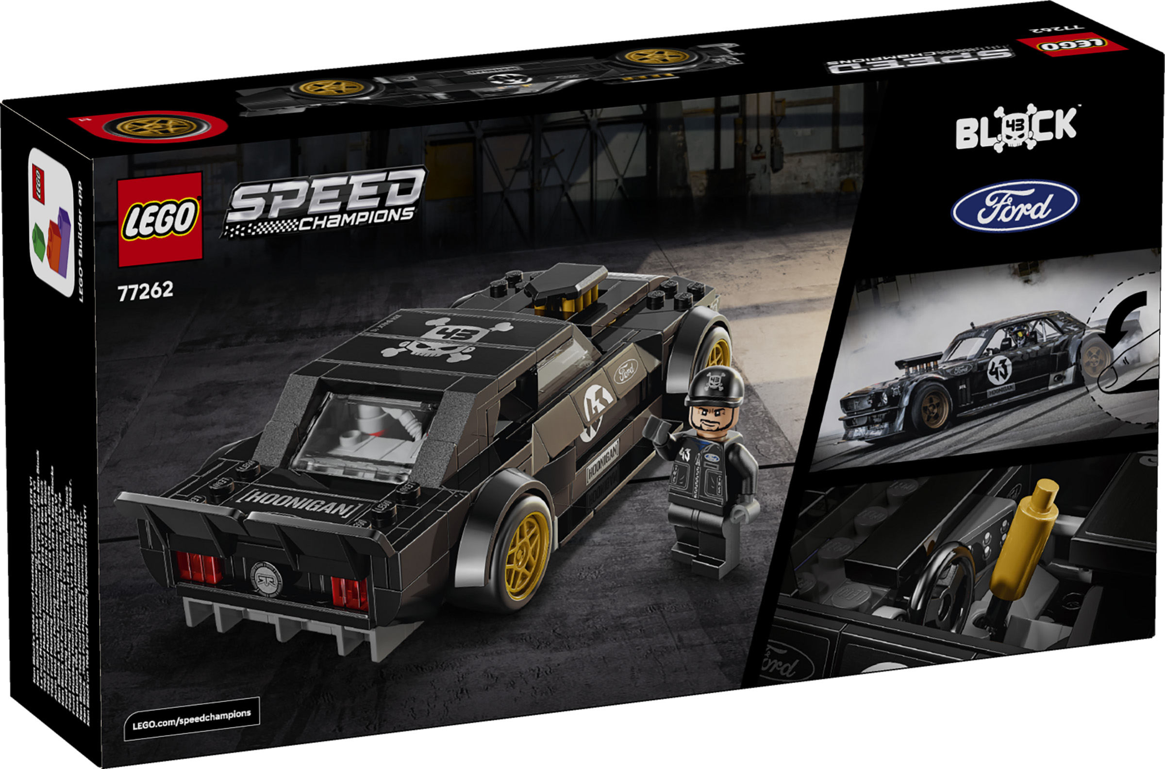 La miniature reprend plusieurs éléments caractéristiques de cette première Hoonicorn, avec sa silhouette de Mustang fastback, son imposante admission sur le capot, ses jantes dorées, son large kit carrosserie et sa livrée noire marquée du célèbre numéro 43. LEGO y ajoute également une minifigurine de feu Ken Block, avec casque et tenue Hoonigan (sans motoneige).